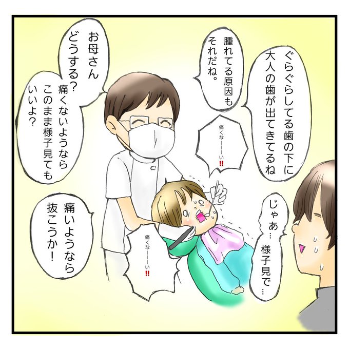 歯の生え変わりの時期はいろいろトラブルがありますね。小学校中学年~高学年で奥歯がなかなか抜けずに、下から大人の歯が生えてきて痛くなって抜歯する子もいるらしい。抜歯となると母も長女もびっくびくです。😰 #育児漫画 #漫画が読めるハッシュタグ #歯のはえかわり