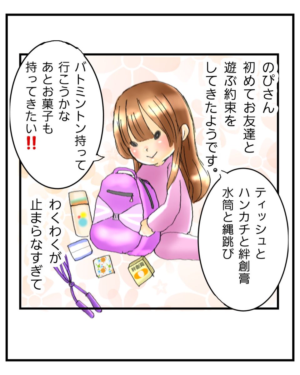 のぴちゃん初めてのお約束① 一年生になってから初めてお友達と遊びのお約束をしてきた次女です。 わくわく感がばっちりリュックサックの重みに現れています。 #育児漫画 #漫画が読めるハッシュタグ #約束