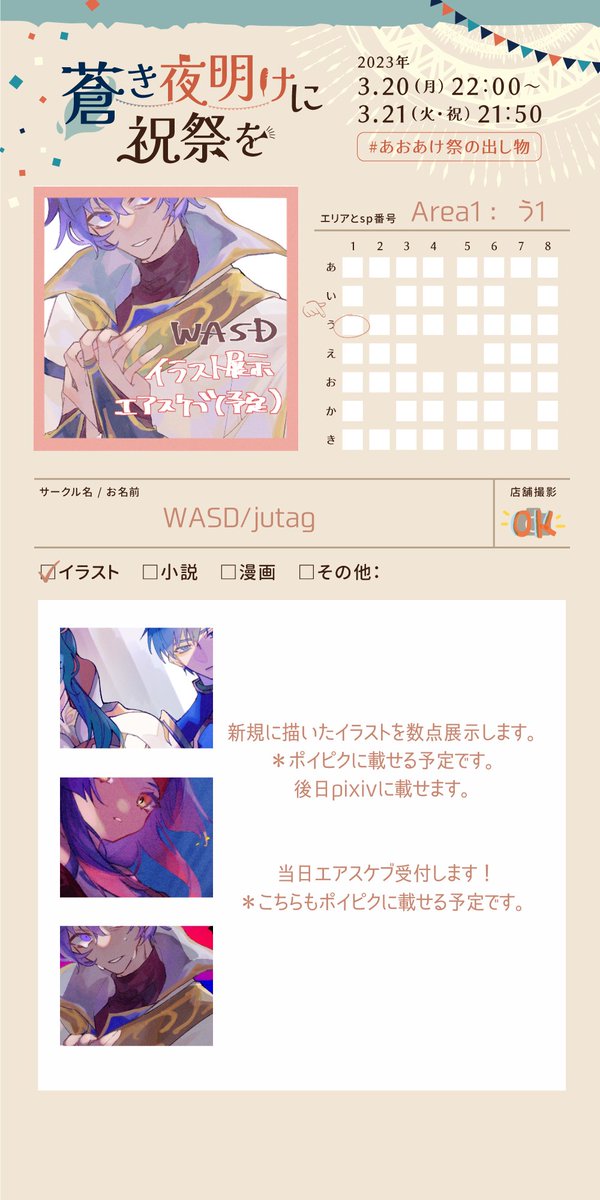 #あおあけ祭の出し物 目処が立ったのでお知らせです! お品書くものもないのですが、新規で描いたイラストを数点展示します。ちょっと寂しいので当日はエアスケブも受付します。設定資料集装備して待機してます~当日はよろしくお願いします!