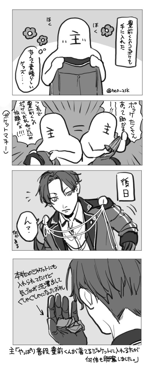 5 34 1/29 閃華42で私の新刊とユキト(@ykt_tk )さんの新刊の2冊同時購入でお渡ししてたノベルティです😸 ユキトさんの豊前くんをコラボでイラスト化させてもらいました😊 もらってくださった方ありがとうございました🙇♂️✨ ※cos 23/02/01 22:54