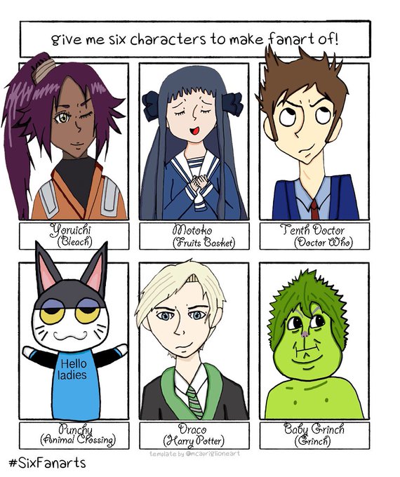 #SixFanarts #bleach #DoctorWho #fruitsbasket #animalcrossing #grinch #harrypotter @bbcdoctorwho @DoctorWho_BBCA @fruitsbasket_en I hate that grinch one omg thanks a lot @opalilith