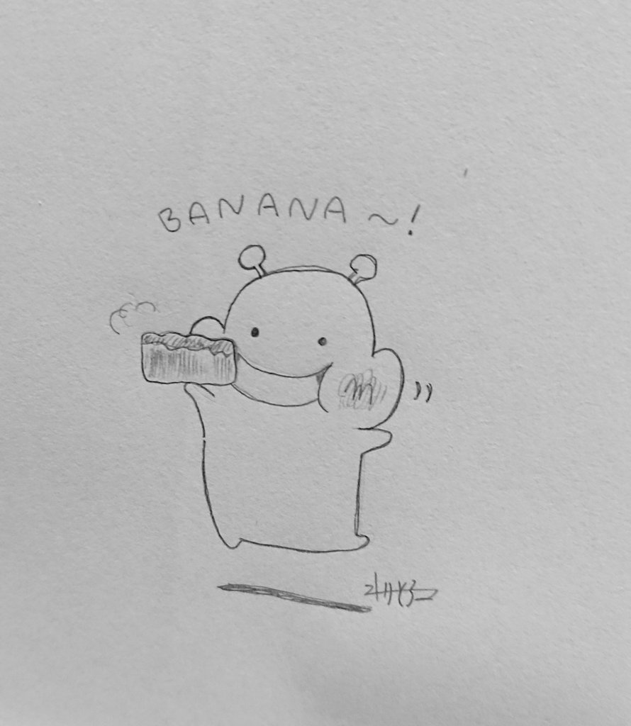 バナナケーキ🍌焼いたー ほっかほかで美味しい❤ #ほっぺちん #ゆるいイラスト #LINEスタンプ #イラスト好きさんと繋がりたい
