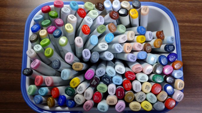 今回使ったコピック。123色ありました。ウプッ🤢 塗り忘れに気付いたら直ぐに対処出来る様に、保存ケースにしてる箱には直ぐには戻さず机に積んでます。123色ェorz 例えばクーラ。全キャラ共通下塗り2〜3色にジャケットだけでも5色重ねてます。 問題はそうは見えないって事ですねorz #コピック twitter.com/netarou005/sta…