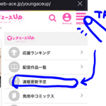 #育オジベイビー は、大体隔週を基本に更新予定です。 サイトに飛ぶと、漫画の最後に「次回更新予定日」が出てきます。(画像一枚目) また、サイト上部のメニューの丸印をつけた項目からも確認が可能(画像二枚目)です。
