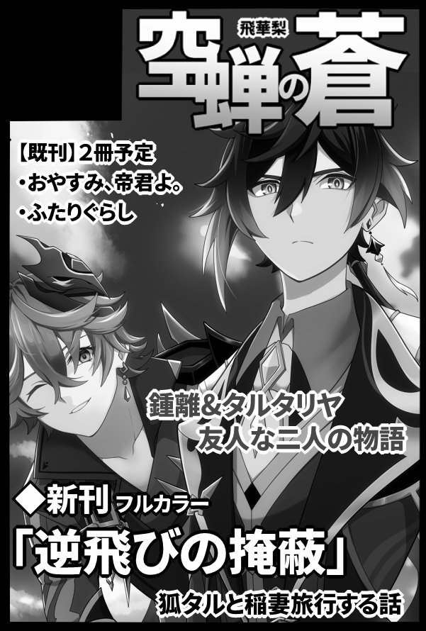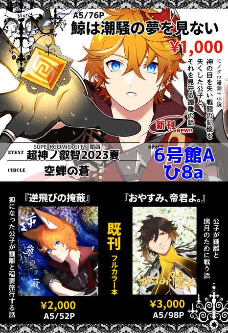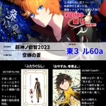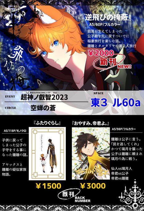 【お品書き】 5月3日(5/3) SUPER COMIC CITY 東京ビッグサイト ■ 超神ノ叡智2023 東3 ル60a 「空蝉の蒼」 ▼『新刊』逆飛びの掩蔽 ▼『既刊』おやすみ、帝君よ。 ▼『既刊』ふたりぐらし サンプルはコチラ↓↓ 【pixiv.net/user/1333729/s…】