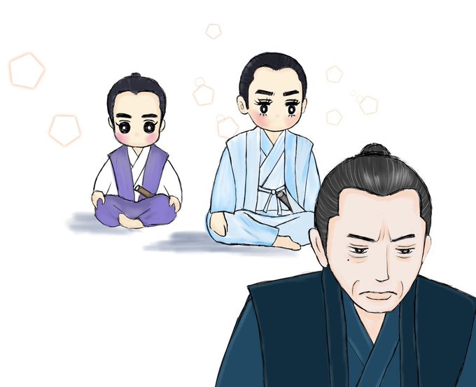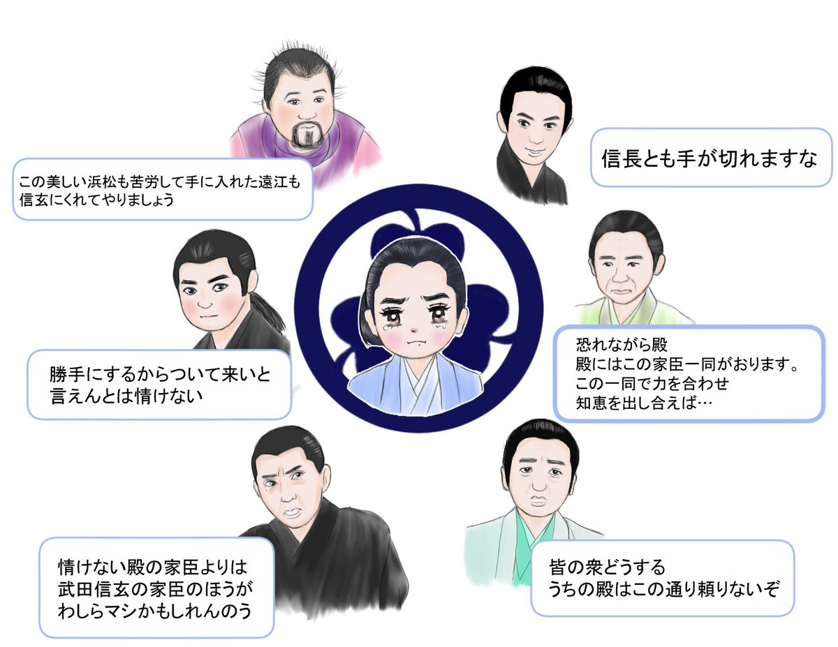 築山の悪い噂について、家臣達が殿に報告するシーン。 このところますます貫禄が増してきたきた殿だけど めちゃくちゃ渋い数正の後方に万千代と座っている図はセットでかわいいな と思ったので。 #どうする家康 #どうする絵