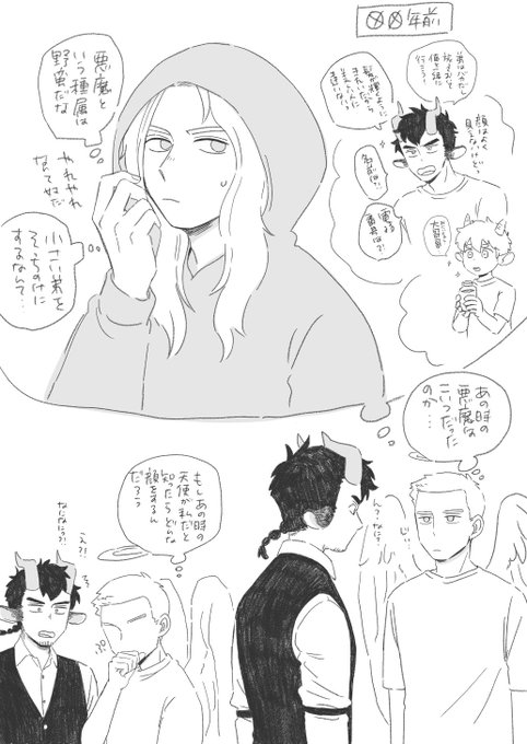 万神街描きたくなった妄想らくがき 天使ニックとの出会い、さらっと描かれてるけど原作でのニックとリン先生の初対面と全く同様最初はめっちゃ馴れ馴れしかったらいいな〜そして電球の精回のように一目惚れしててほしいー まあルイスとアイラの創作の話なんだけども
