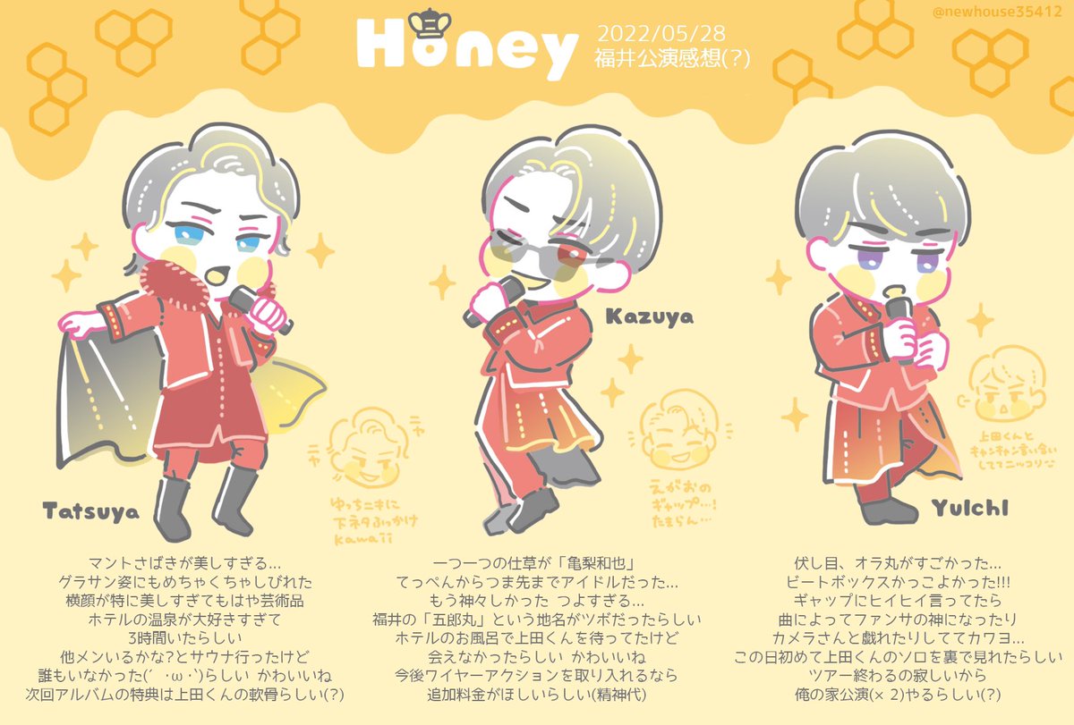 🐝Honey 0528福井公演 感想🐝 初めて3人を見られた感想絵🎊 🌟MCレポ少々有/本編レポ無し(一応ご注意⚠️) 🌟衣装はワイドショーで紹介されてたもの(のうろ覚え)