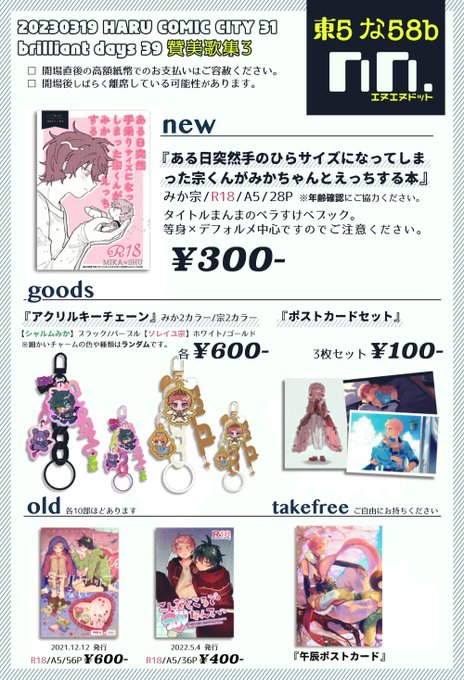 24 112 明日のお品書きですギリギリに失礼します… グッズの写真が間に合わなさそうなのでこんな感じというのだけ先に…おもちゃみたいなジャラジャラキーチェーンです。ピンクオーロラとゴールドのアクリルにシャルムとソレイユ😈👼 無配は春の午辰!キラキラのポスカです🌸 23/03/18 21:21