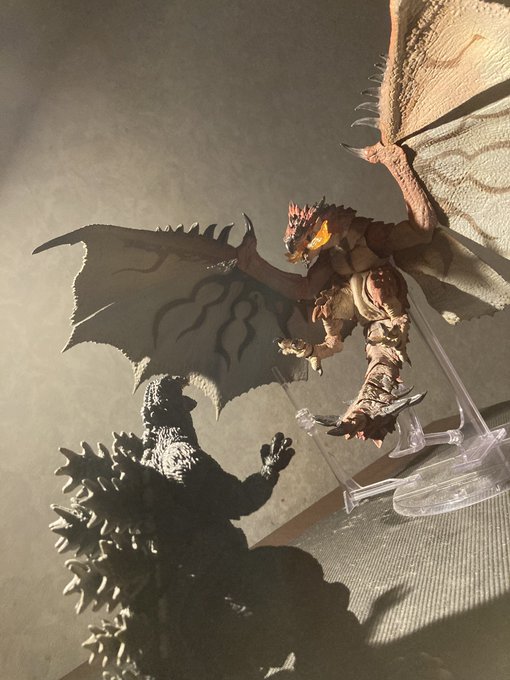 『跳びながら熱線を吐くゴジラ』 ゴジラvsヘドラでこんなシーンが見たかった #フィギュア撮影友の会 #夜のフィギュア撮影会 #ゴジラ #ヘドラ #ゴジラvsヘドラ #SHモンスターアーツ #SHMonsterArts