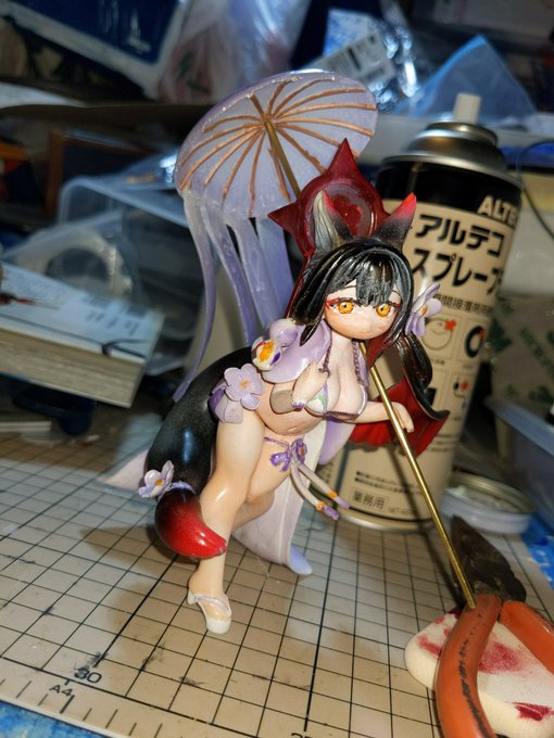6 8 ワカモ組み上がり……なんだけど、傘からぶら下がってる奴の塗装する向きを間違えて当初の予定とは違う形でゴールになった…… ヘイローの固定はこれから考えます #ブルアカ #WF2023S 23/07/16 20:14