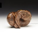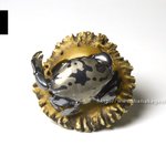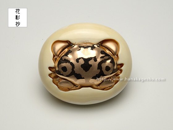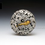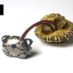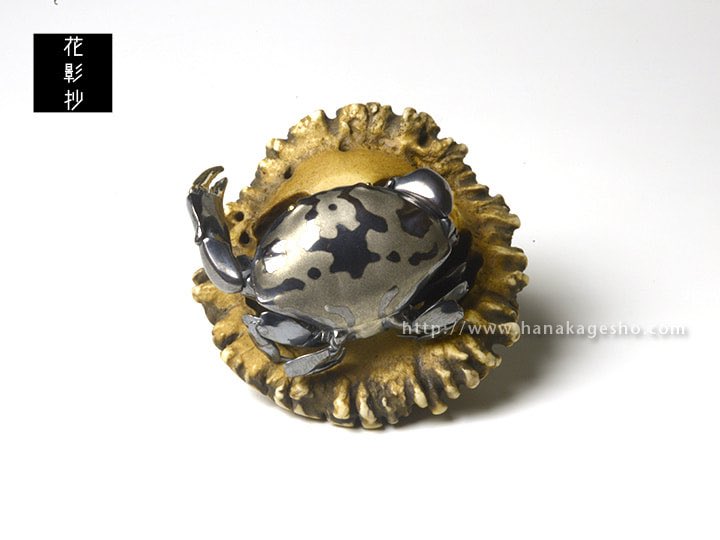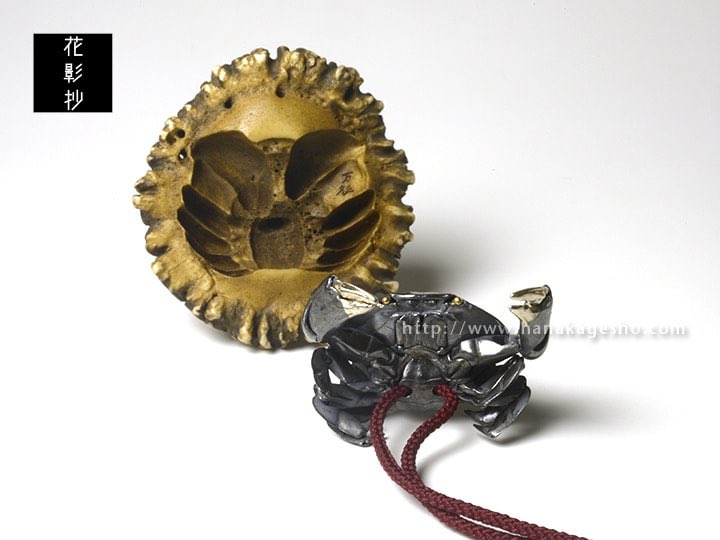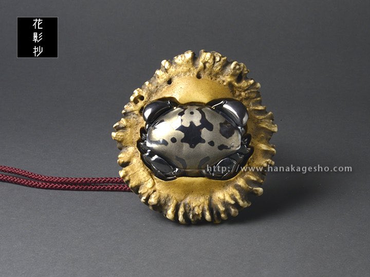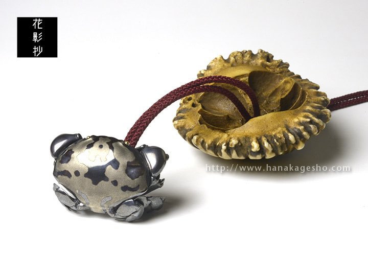 万征「滑々饅頭甲殻根付」 蟹の自在置物が鏡蓋根付仕様になっています。 「スベスベマンジュウガニが収まる物体は藤壺、藤壺は貝類ではなく、甲殻類。」 hanakagesho.com/nezu-netsuke/n…