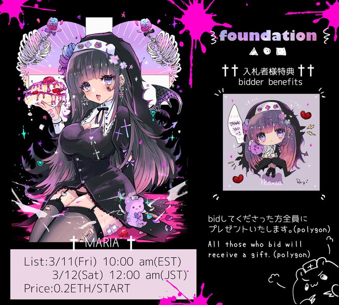 【notice】 Mint now💜😈 「SAIKYO SISTER MARIA」 List:3/11(Fri)10:00am (EST) 3/12(sat)12:00 am(JST) Price:0.2ETHstart foundation.app/@r_yoshiduki/r… #Foundation #nftart #NFTCommunity #NFTJapan #withfnd #nftdrop #FND