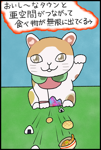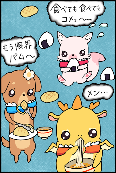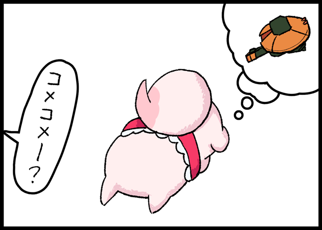 ①具をジェスチャーで教えてくれるコメコメのおにぎり屋さん ②すぐ完売しちゃっておにぎり屋さんが終わってしまって泣いて帰るコメコメ ③完売しないように大量におにぎりを作って運ぶコメコメ