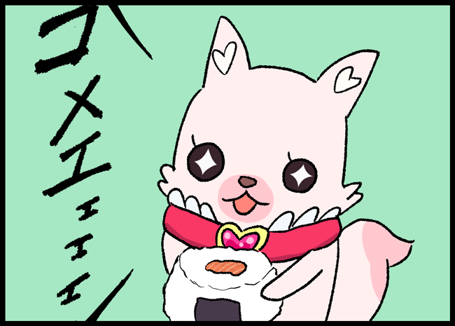 おにぎりに入っていた具(鮭)が嬉しくて見せて来るコメコメ