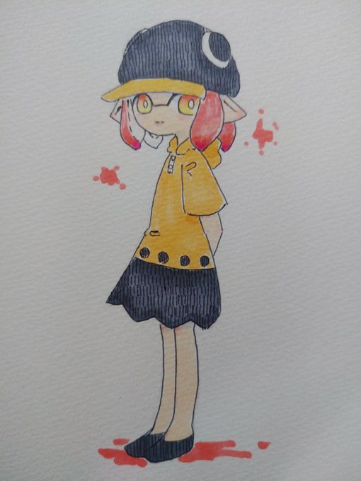 #GWお絵かき合宿 ペンギンちゃんの服を着たイカちゃんと課題のデッサンです! (インクの色が血みたいになっちゃった…)