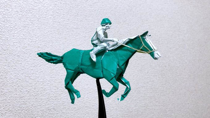1321 3365 折り紙で馬に乗る子供を折りました 馬具以外すべて(緑と白の部分)、一枚の正方形から切らずに作っています 18/06/26 00:40