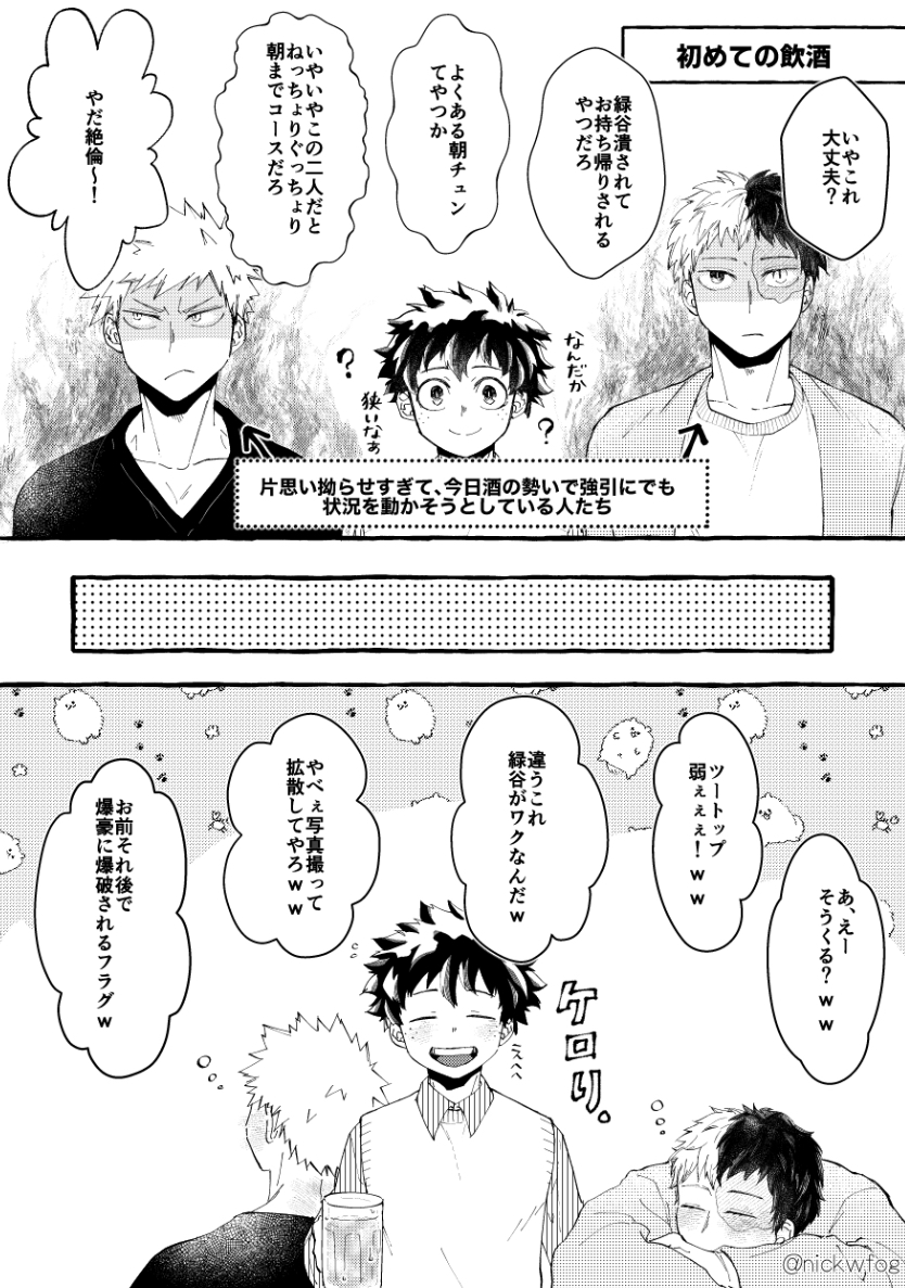 ツー出(というか勝→出、轟→出) 💥🥦、🍰🥦 超絶鈍感🥦に痺れを切らして、飲…酒解禁の飲み会で意気込む💥&🍰の話