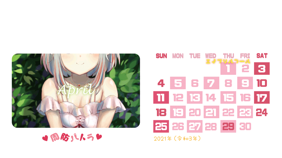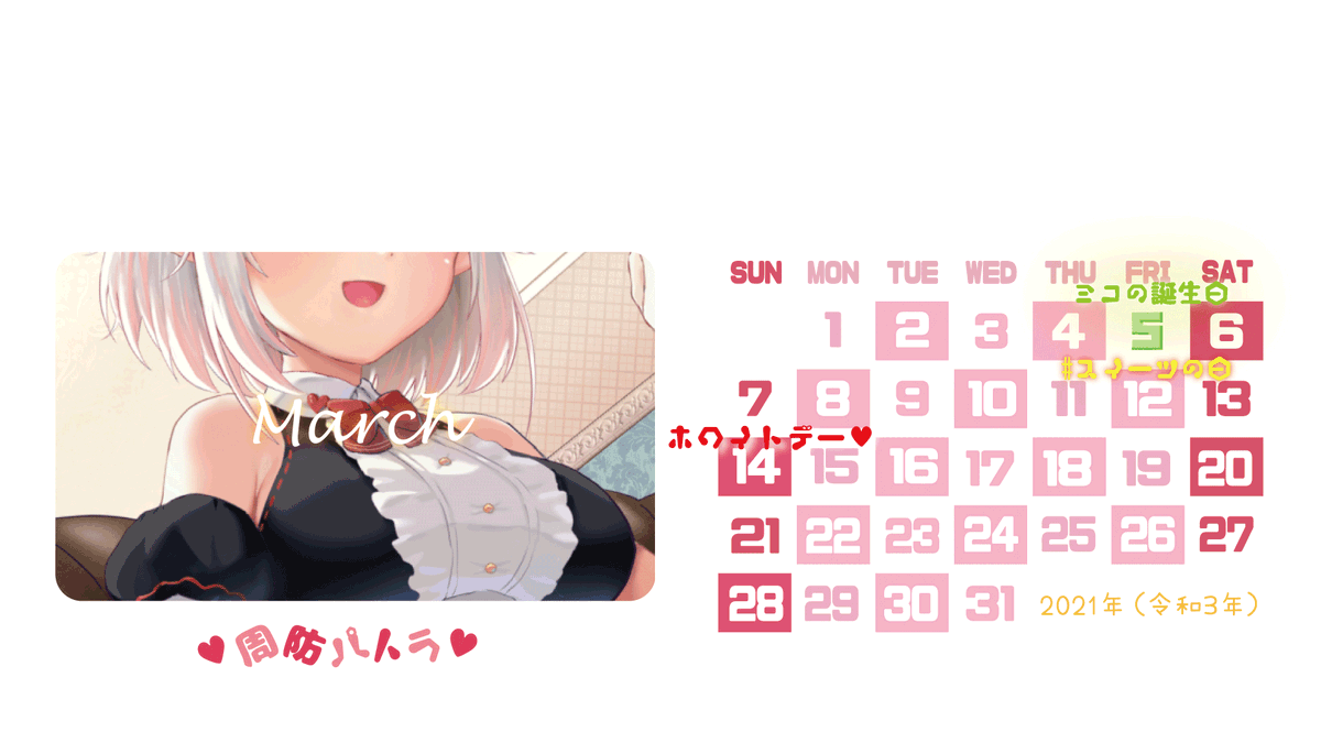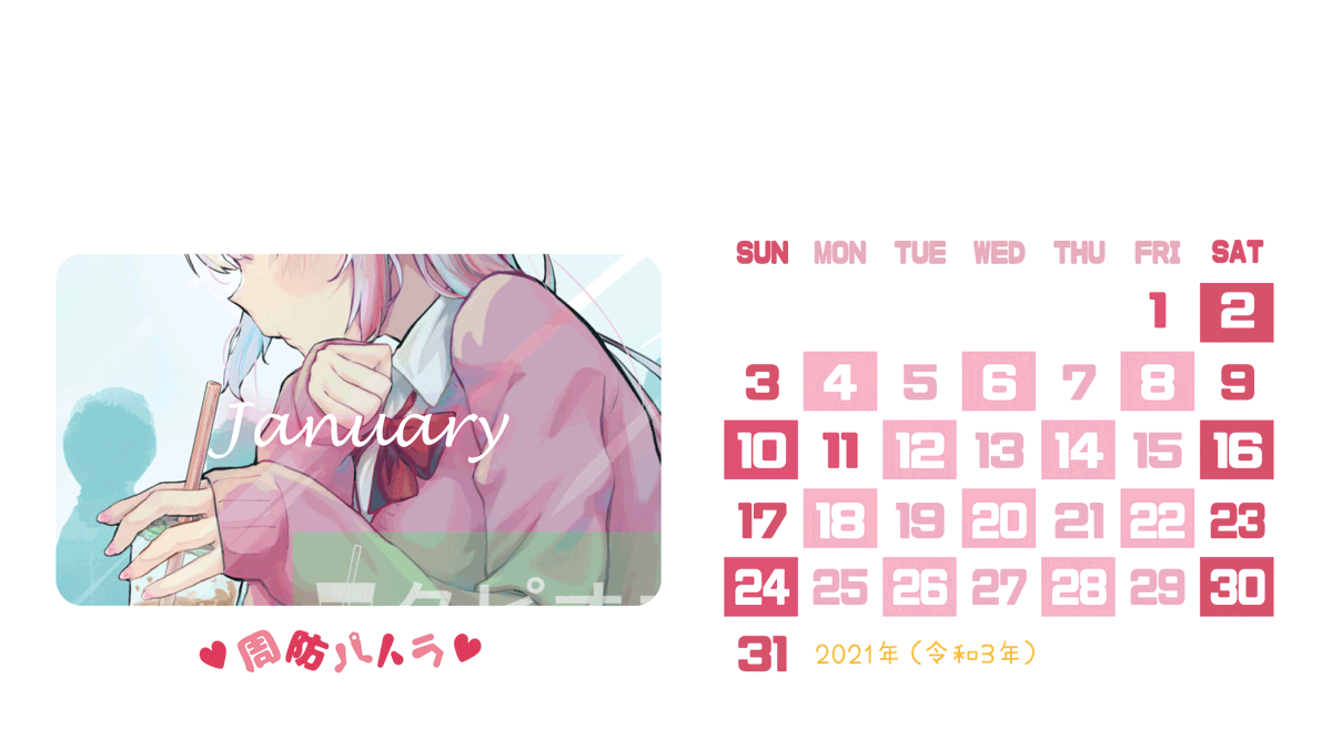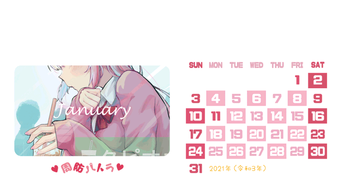 #パトラのアトリエ #周防パトラ 2021年(令和3年)の🦀パトラちゃんカレンダー作ってみました。 1920*1080サイズです。パソコンに使えるかも? 良ければご自由にお使いください!! 記念日は個人の好みで記入しました。🙇♀️ zhinangua.fanbox.cc/manage/posts/1… FANBOXにも投稿しました。