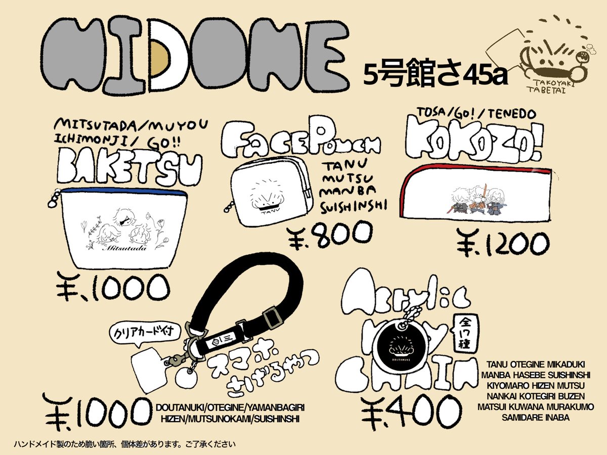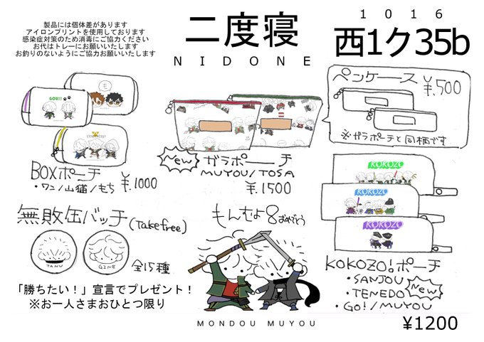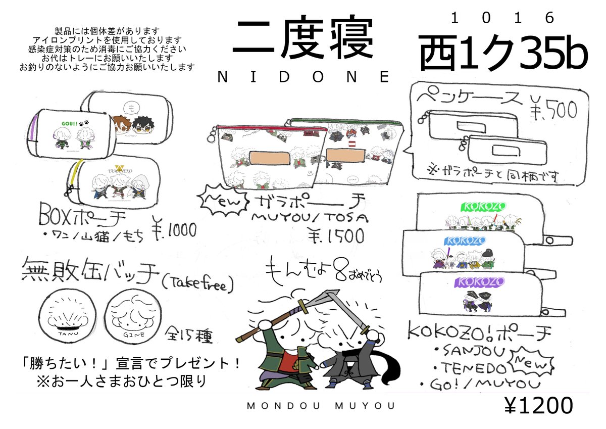 10/16 TOKYO Fes Oct.2022 閃華の刻38 🍳拡散嬉しいです!🍳 西1ク35b 二度寝 お品書きです!! ポーチ中心で色々置いております! 問答無用8開催おめでとうございます!!!!