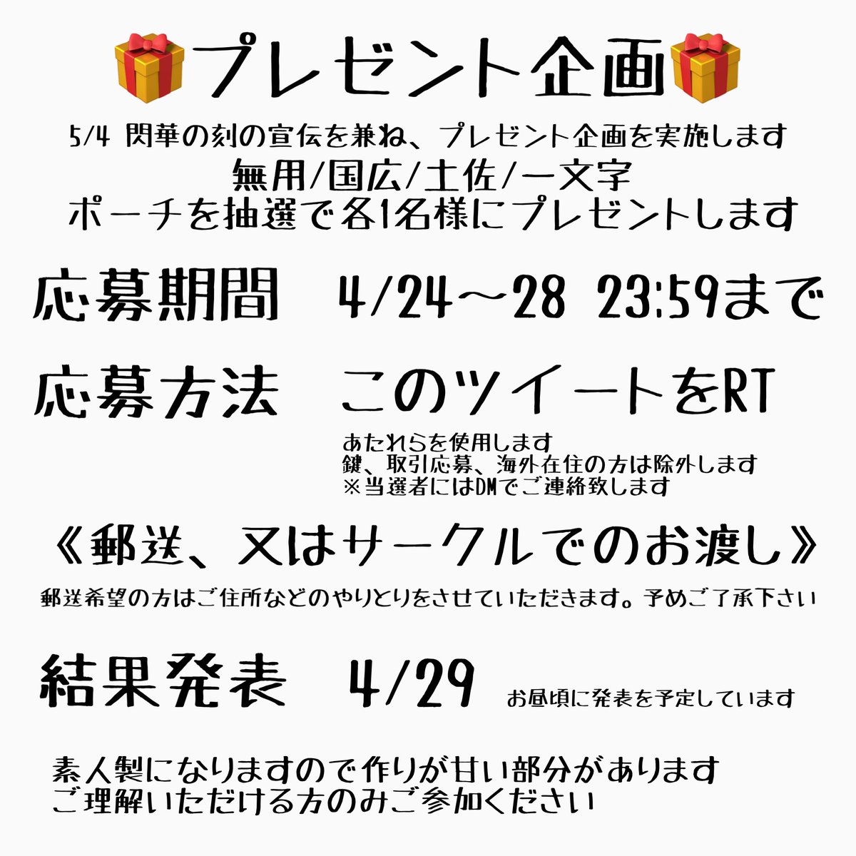 77 36 【プレゼント企画】 5/4の「閃華の刻」にて頒布予定のポーチのうち、抽選で無用、国広、一文字、土佐を各1名様にプレゼントいたします! 応募方法は画像3枚目をご確認くださいませ。 応募締切:4/28 23:59まで よろしくお願いします!! 22/04/24 20:23