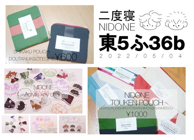 53 62 RT大歓迎🫰5/4 閃華ふ36b 二度寝 お品書き〜!! ゆるゆるポーチとアクキ〜を作って持っていきます! 詳細はツリーに! 22/05/01 18:37