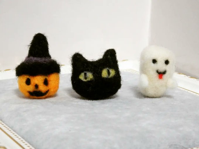 2 7 ハロウィンのオーナメント用にと羊毛フェルトで作成中。お菓子のラッピングとかハロウィンの飾り付けで壁に貼り付けたりとか、色々使えるかも? 完成したらミンネ等で販売予定です✨ #ハンドメイド #ハンドメイド好きな方と繋がりたい #羊毛フェルト #ハロウィン #かぼちゃ #黒猫 #おばけ 21/10/06 15:14