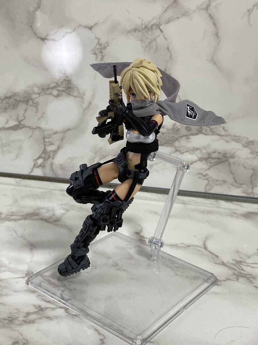 ウチのエーデルワイスベースのアザミさんはゲリラ戦仕様の黒肌ダークエルフ。 デルさんはパーツ単位でも良いのが多いしとてもオススメ。 #めっちゃええでるわいす #メガミデバイス #武装神姫