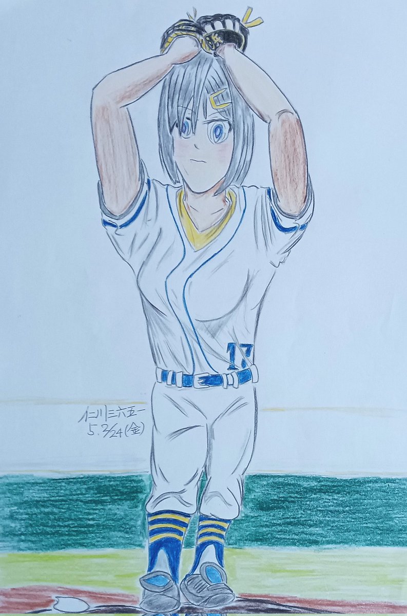 #艦これ版深夜の真剣お絵描き60分一本勝負 #艦これ版真剣お絵描き60分一本勝負_20230224 #浜風 「おおきく振りかぶって!」 現代の野球では少なくなったワインドアップでの投球モーションを浜風さんにやってもらいました😁 後になって見ると、上半身と下半身がアンバランスですね😅