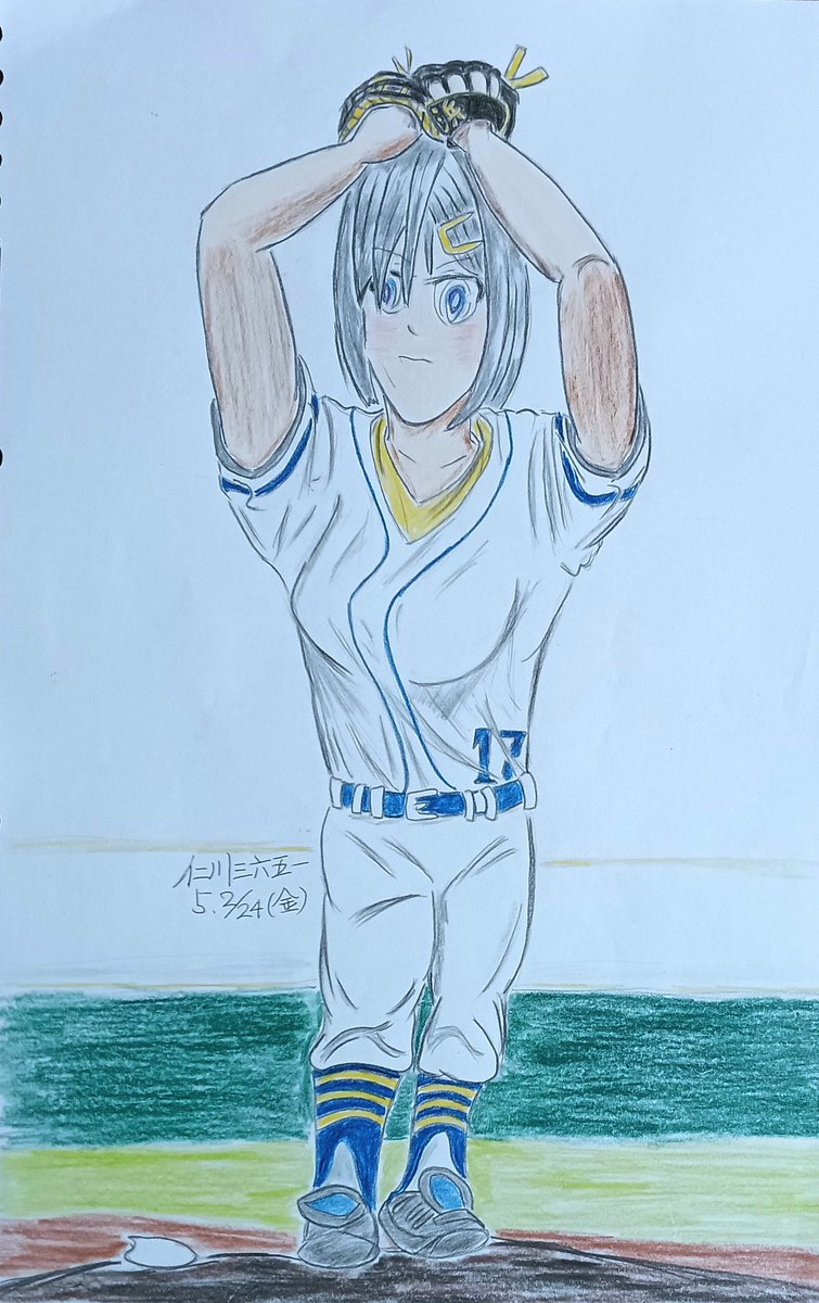 #艦これ版深夜の真剣お絵描き60分一本勝負 #艦これ版真剣お絵描き60分一本勝負_20230218 #飛龍 自分のアカウントの中で野球やる子にした7番目の艦娘。 先に蒼龍さんを三塁手にしたので、飛龍さんの守備位置はレフト。 左投げなのは、艦の時代に艦橋が左側にあったから。あまり似てへんなあ😅···