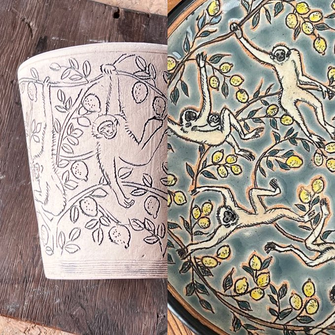 作者が好きなモチーフが 受け入れてもらえる(ウレル)ものではない。 わかっているけど描きました、で、このレモン林のテナガサルは意外なことに増販に♪マグカップにも描いてみました。 #シロテナガザル