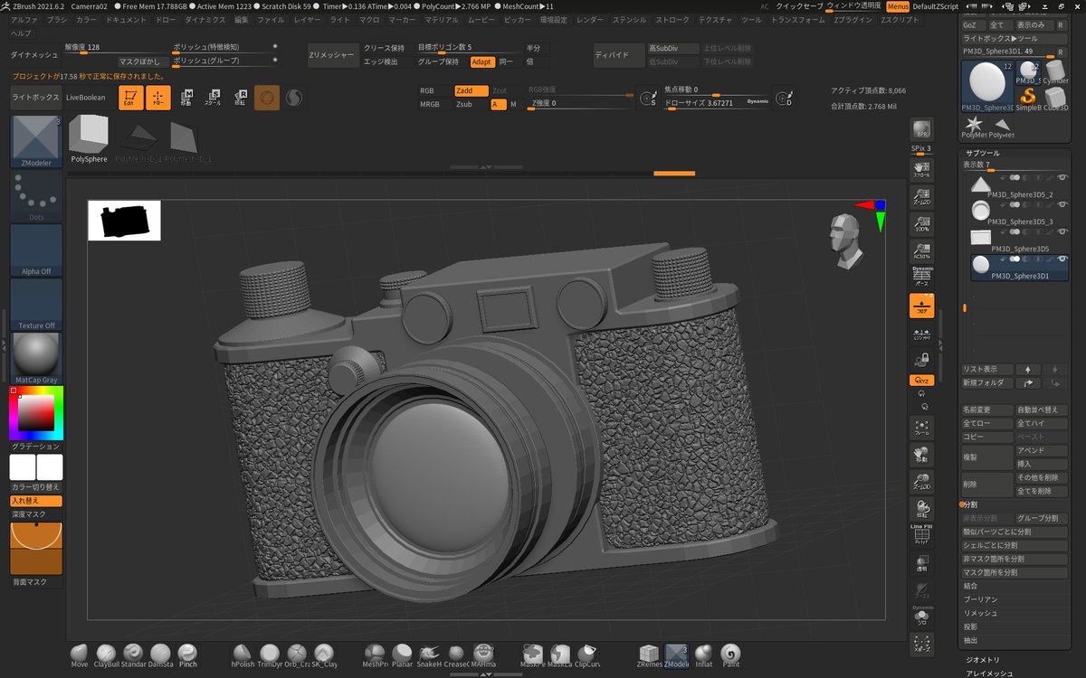 おさらいにもう一回カメラ作れと言われたので唯々諾々と作った。ZBrushに関しては、のぶほっぷさんに言われるがままである。途中で犬をいじめろとかの命令が無くて本当に良かった。