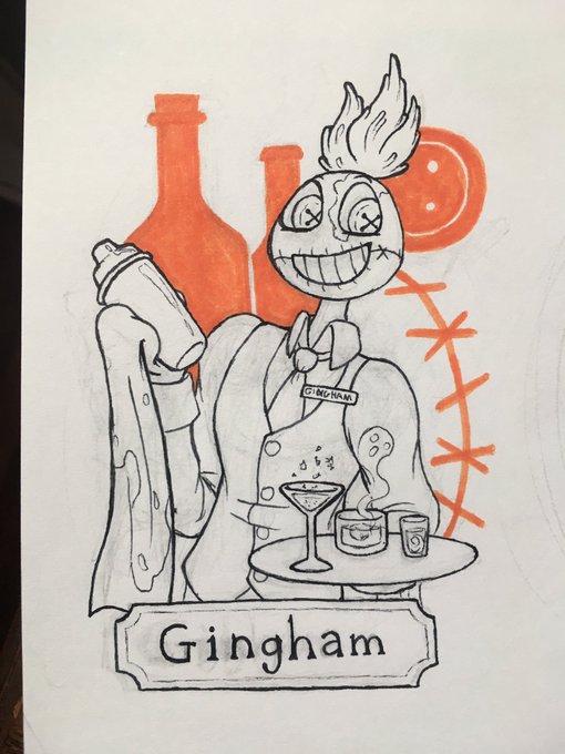 Inktober Day 9 Gingham the cloth golem is the owner of The Demon Bar, a place where all magical beings, good and evil, can come to have a safe space to hang out and perhaps grab a drink or two #inktober #inktoberchallenge #inktober2022