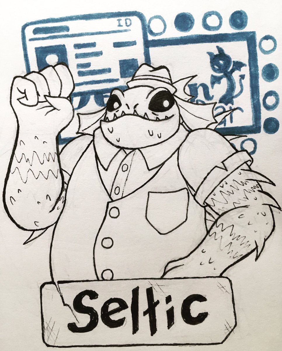 Inktober Day 14 Seltic is the bouncer of The Demon Bar and plays various brass instruments for the establishment’s electro swing band. He’s short, loud, brash, and will not hesitate to literally toss out troublemakers #inktober #inktoberchallenge #inktober2022