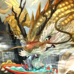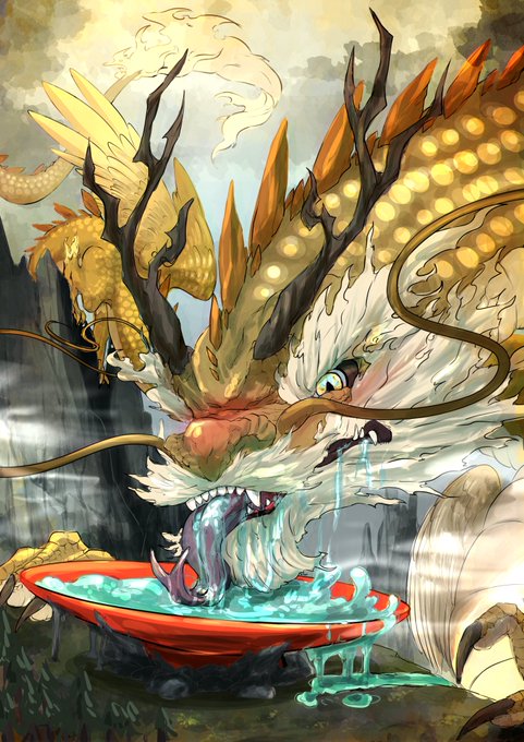 #100日チャレンジ 村人がお供えした大量のお酒をチョビチョビ飲む(舐める?)のが好きなんだけど、飲むのが下手くそすぎて半分は溢しちゃう応竜さん。 (応竜の力が混ざり溢れた酒は川となって村の大地に溶け込み、村の繁栄に繋がってるそうな)