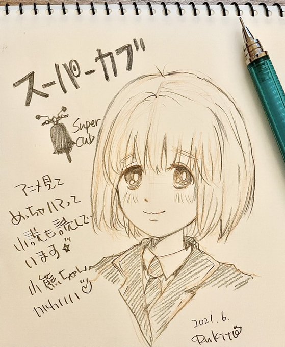 2 3 スーパーカブにハマってしまった😊 カブに乗りたくなってしまう…🛵 小熊ちゃん描いてみたけど、 女の子描くの難しいなぁー( ˶ˆ꒳ˆ˵ )エヘヘ 山梨に聖地巡礼行きたいなぁ₍ᐢ.ˬ.ᐢ₎ #スーパーカブ 21/06/16 22:07
