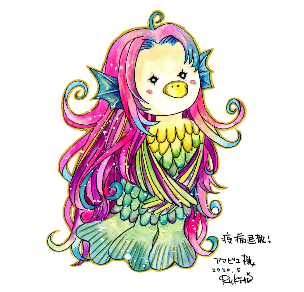 アマビエ様を描いてみたよ。 疫病撃退。 早く日常が戻ってきますように...🙏 #AAAツイッター展覧会 #アマビエチャレンジ #アマビエ様