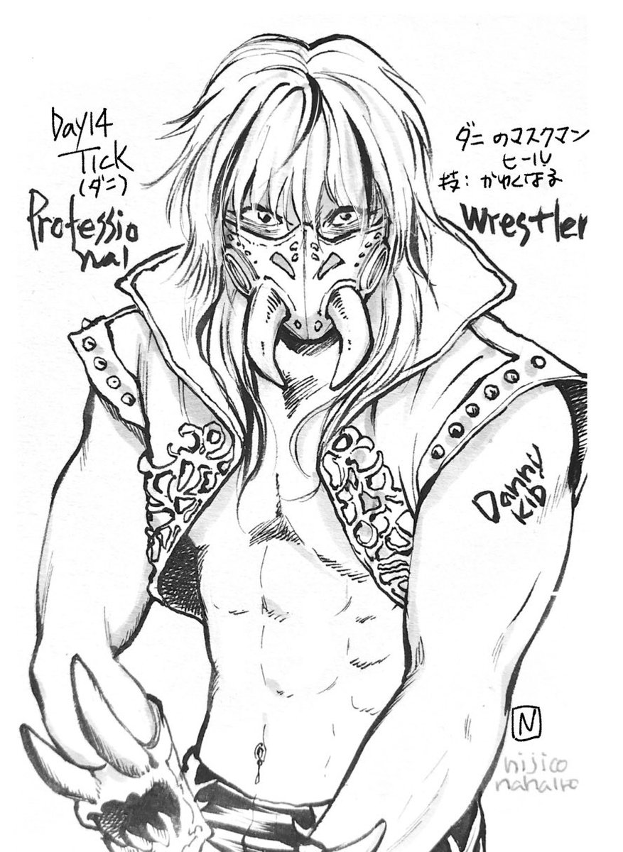 day 14 Tick (ダニ) ダニなんで描きたくないな〜と思ってダニ型?マスクマン。 “DannyKid” 中の人は実は潔癖症。 技を受けたあと相手のレスラーは痒さに襲われる。 #kuretake_inktober2021 #inktober2021 #inktober #インクトーバー2021 #呉竹