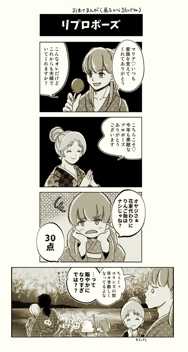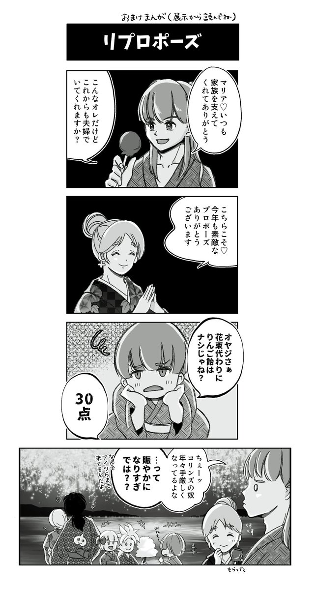 先日のイベント会場限定でネットプリント頒布していたペーパーに載せてたオマケ漫画です。 展示漫画の後日譚なので読んでない方はツリーから是非🎆 pixiv▶︎pixiv.net/artworks/10987…