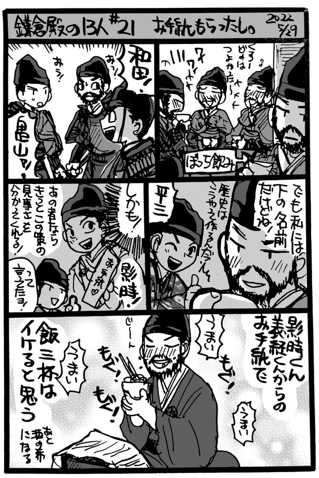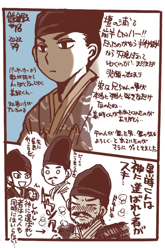 98 720 21話ネタ。御家人たちが義経凄かったよねディスカッションしていたのが良かったです。義経くんは平三、景時どっちも呼びしてたかな。この二人の関係性好きでした。 #鎌倉殿の13人 #殿絵 22/05/31 19:49
