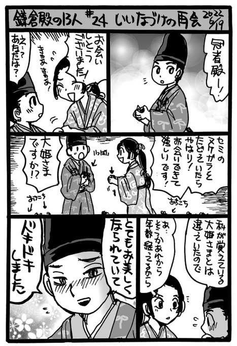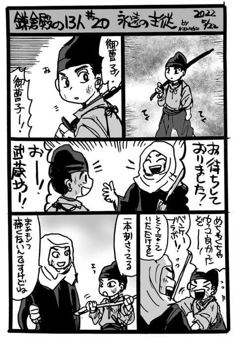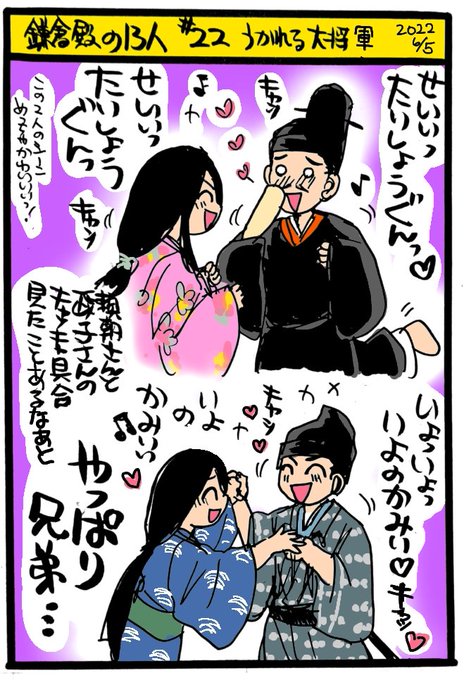 331 2100 24話ネタ。大姫ちゃんが冠者殿に会えるて言うから会えたお話を描きました。巴さんが義仲さんにも和田さんにもデレていたのが良かったです #鎌倉殿の13人 #殿絵 22/06/24 19:40