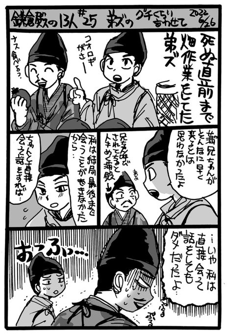 344 1733 25話ネタちょっとフライングかも?あっちの世界の蒲殿を描きたかったのです。弟ズが兄ちゃんを待つ話、だが思ったより兄早く来ちゃって… #鎌倉殿の13人 #殿絵 22/07/01 19:37