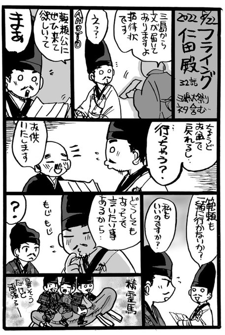 1235 4594 32話。仁田殿の残酷すぎる選択がしんどいので楽しかった三嶋大祭り含めたネタを描きました 。や、結局しんどいんですが… #鎌倉殿の13人 #三嶋大祭り #殿絵 22/08/21 20:51