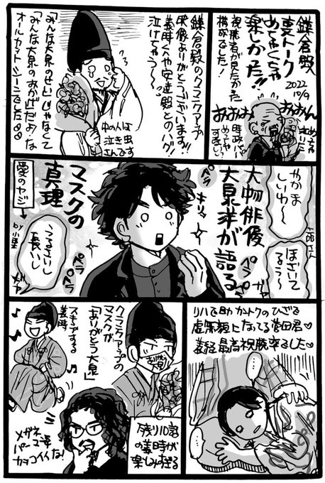 98 541 鎌倉殿舞台裏スペシャルトーク楽しかった感想です。鎌倉殿の撮切ノーカット版も見たすぎる!VTR組のトークや貴重メイキングありがとうございました。最終回後のスペシャルトーク回もやって欲しい✨ #鎌倉殿の13人 #殿絵 22/10/10 20:41