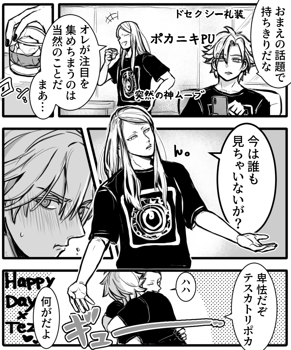 デア飲みで酔っぱらったテを迎えに来たデイくん(テから呼び出しがあった)。 糖度高いデイテスが大好きなので、なんとかテ神をデレさせたいとこね回した結果の落書き...なんだけど、デイくんには神様のデレは難易度が高くてよくわからないのであった
