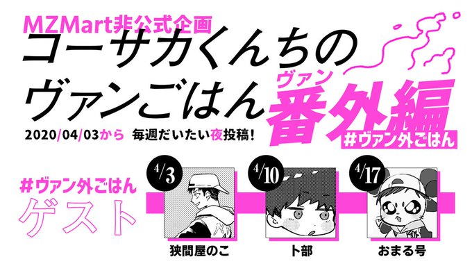 108 289 コーサカくんちのヴァンごはん 番外編 夏コミがないので旬なうちにゲストが原稿をうpする祭📚 4/3夜からヴァンごはん本ゲストの皆さんの作品連続投稿企画やるわよ 🦇ゲスト🐺 狭間屋のこさん@samayanoko 卜部さん@0241un おまる号さん@mogmogshrimP4 #MZM #MZMart #ヴァンごはん #ヴァン外ごはん 20/04/02 18:54