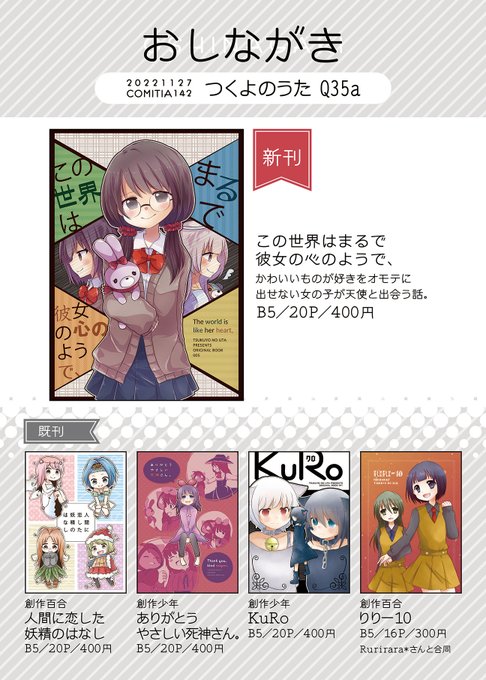 🌸2023/05/05(金) COMITIA144 【M21a】 当日のお品書きです。新刊あります! ちょっぴりホラー要素有りの不思議なお話。 その他、既刊個人誌も持っていきます。 新刊のサンプルはツリーにて。 皆様の当日のお越しをお待ちしています! pixiv.net/artworks/10771…