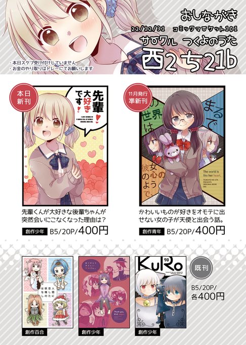 🌸12/31(土) コミックマーケット101 (冬コミ2日目) 【西2ち21b】 当日のお品書きです。新刊あります。 その他既刊も持っていきます。 新刊のサンプルはツリーにて。 皆様の当日のお越しをお待ちしております。 pixiv.net/artworks/10397…