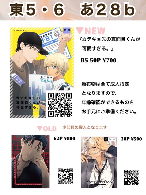 こちら7月24日のお品書きになります! スペース:あ28b ⚠️全て成人指定の頒布物となりますので、年齢確認のご協力お願いいたします! ⚠️既刊は小部数となっておりますので、ご入用の方はお気をつけください🙏💦 新刊サンプルはコチラ→pixiv.net/artworks/99846…