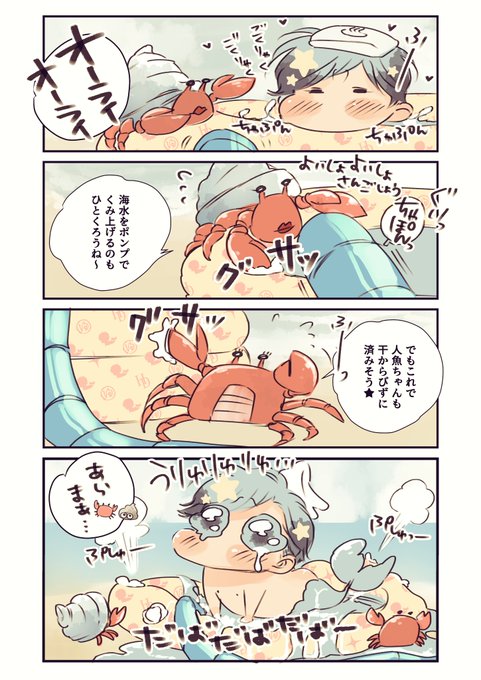 久しぶりの人魚ちゃん ナツさんのこれ想像したら可愛かったので描いてみた🧜♂️🦀🦀 #創作漫画 #人魚ちゃん twitter.com/72natty72/stat…